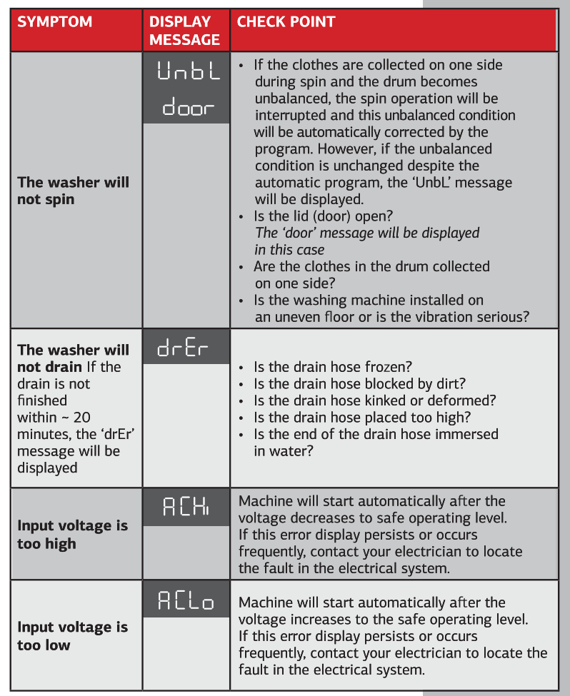 | UnbL | Washer not spinning (Unbalance) | Clothes collected on one side. Check load distribution, drum balance, door status, and machine leveling. |