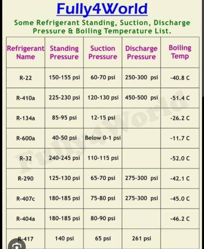 Below is a standard refrigerator and AC gas pressure reference chart. Values may slightly vary depending on ambient temperature and system condition.